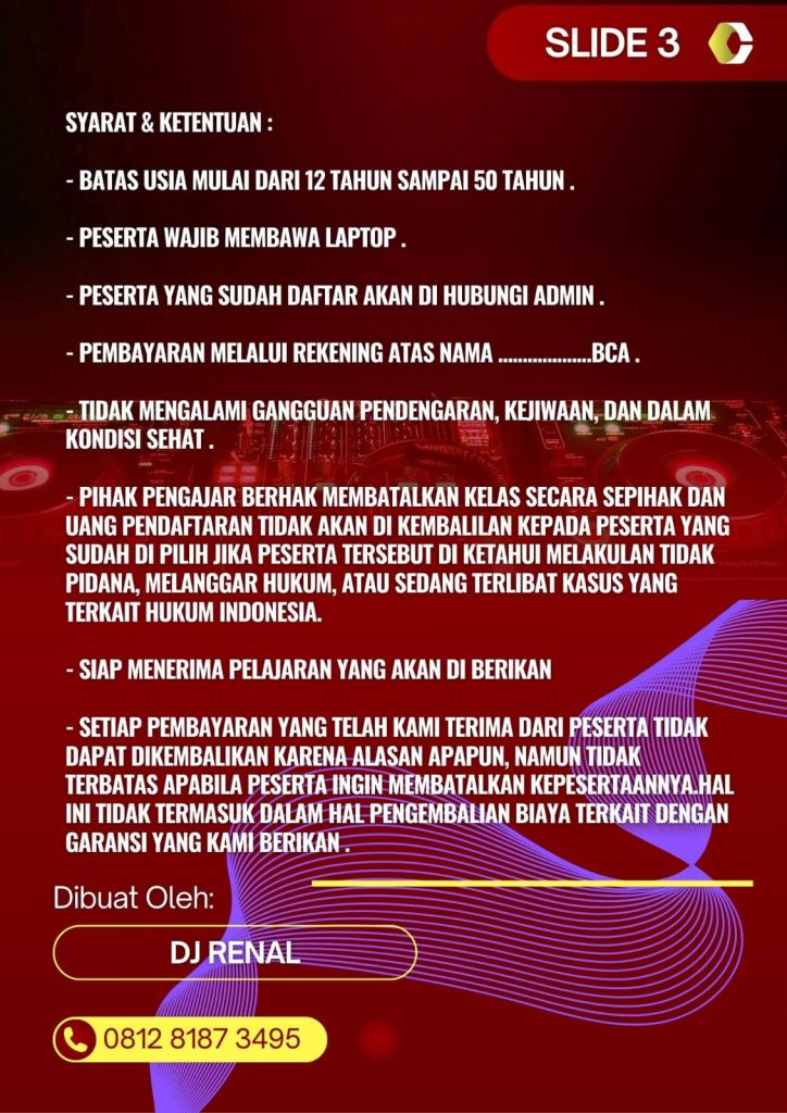 “PRIVAT DJ SCHOOL” mengacu pada sekolah atau kursus DJ yang menawarkan pelatihan secara privat atau satu-satu.